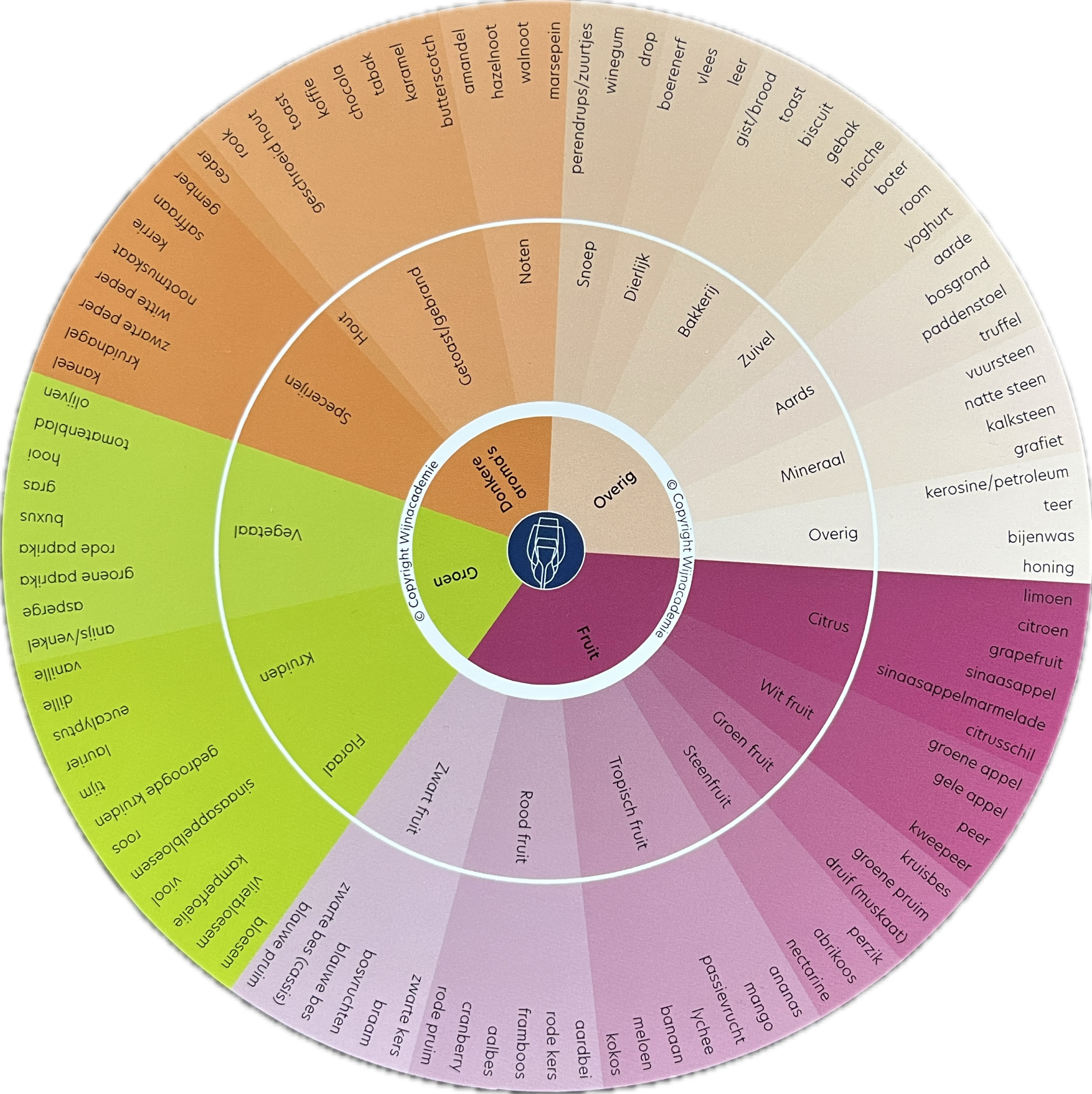 De aromawijzer, ook wel aromacirkel voor wijn genoemd, is een handig hulpmiddel om beter te leren proeven en om aroma’s in wijn gemakkelijker te herkennen en te benoemen.